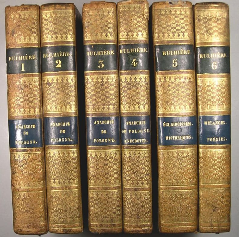Paris, Ménard et Desenne Fils 1819, 6 volumes in/8, reliure de l'époque en pleine basane, marbré, plat orné, dos orné, pièce de titre, coiffes avec des manques. Tome I : Anarchie de Pologne, 342 pages ; Tome II : Anarchie de Pologne, 500 pages ; Tome III : Anarchie de Pologne, 464 pages ; Tome IV : Anarchie de Pologne - Anecdotes, 397 pages ; Tome V : Éclaircissement historique, 570 pages ; Tome VI : Mélanges et Poésies. 462 pages.