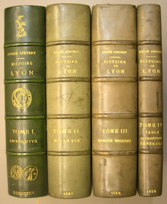 Lyon, Bernoux et Cumin, 1895, 4 volumes. In/4, reliure en demi-chagrin vert bronze, à coins, dos à nerfs, orné, doré sur tête pour le volume 1, Tome I : Antiquité, depuis les temps préhistoriques jusqu'à la chute du royaume Burgonde (534), illustré par l'auteur de 800 dessins, cartes, plan, etc... 614 pages - Tome II : Moyen Âge, depuis la chute du royaume Burgonde (534) jusqu'à la mort de Louis XI (1483), illustré par l'auteur de 753 dessins, cartes, plans, etc... 668 pages - Tome III : Époque moderne, depuis le renaissance jusqu'aux cent jours, illustré par l'auteur de 700 dessins, cartes, plans, etc... 666 pages ; XXIV liste des souscripteurs - Tome IV : De la seconde restauration jusqu'en 1899, illustré de 101 gravures et d'un portrait de l'auteur, table alphabétique général. 395 pages, table alphabétique de la page 160 à la page 395. Le volume 4 a été édité plus tardivement que les trois premiers en 1939.