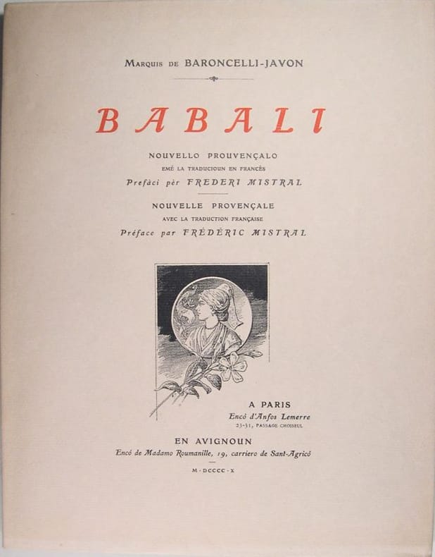 A Paris / En Avignoun, Enco de Madamo Roumanille, 1910, in/4 broché, 57 pages. 33 illustrations hors et in texte dont 8 aquarelles en couleurs. Tirage limité à 1080 exemplaires, celui-ci sur vélin, numéroté. Avec la traduction française. Préface par Frédéric Mistral.