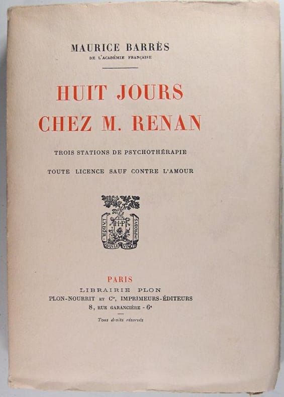 HUIT JOURS CHEZ M. RENAN Trois stations de psychothérapie - Toute licence sauf contre l'amour Maurice Barrès vol broché, 190x140, sur grand papier, très bel état int. 262pp Exemplaire numéroté sur pur fil Lafuma 585 Paris, Plon 1923 ref/130