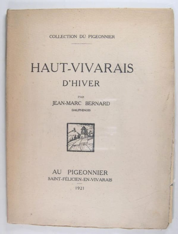 Au Pigeonnier, 1921, 39 pages, In/16, broché, couverture illustrée d'une vignette. Dessins de Bernard Naudin, portrait et paysages Vivarois gravés sur bois par Mme Seguin-Béchetoille. Exemplaire numéroté, N° 88 sur vergé Canson-Montgolfier.