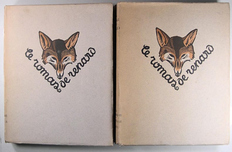 Composée entre 1170 et 1250, le Roman de Renard n'est pas l'oeuvre d'un seul auteur, mais une compilation d'histoires mêlant folklore populaire et création savante de clercs férus de culture latine (Pierre de Saint-Cloud, Richard de Lison). Le Roman de Renard met en scène une féodalité parodique d'animaux (Renard, Ysengrin le loup, Chantecler le coq, Brun l'ours, le corbeau Tiercelin, Noble le lion, Couart le lièvre, etc.) A la fois satire sociale et comédie de moeurs, on y trouve aussi l'inspiration des fables ésopiques gréco-latines. La légèreté drôle des scènes fut la raison de son succès, et de sa postérité. Bel exemplaire. Libraire membre du S.L.A.M. (Syndicat national de la Librairie Ancienne et Moderne) et de la L.I.L.A. (Ligue Internationale de la Librairie Ancienne). N'hésitez pas à prendre contact par mail pour des photographies et des détails supplémentaires, pour des recherches ou des estimations de livres anciens et rares.