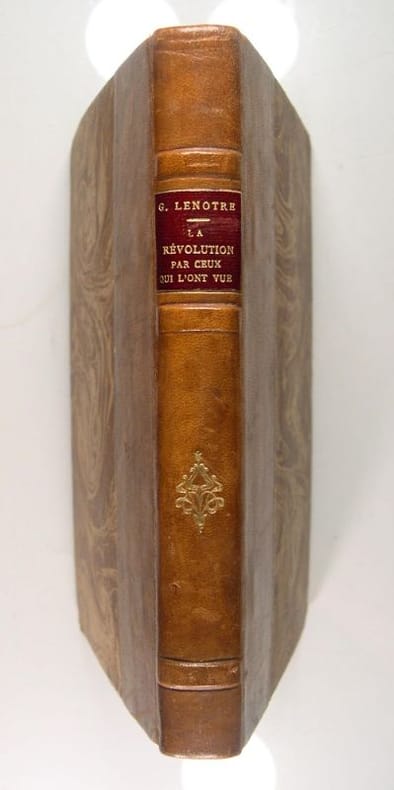 Relié 1934 "Trois volumes in-12 (12,8 x 18,7 cm), reliure demi-peau, dos lisse orné de croisillons dorés, têtes dorées, couvertures en couleur conservées, les 6 premiers tomes (sur 15) de ""La Petite Histoire"" de G. Lenôtre : 1. Napoléon, croquis de l'Epogée // 2. Femmes, amours évanouies // 3. Paris et ses fantômes // 4. Versailles au temps des Rois // 5. La Révolution par ceux qui l'ont vue // 6. Dossiers de police ; quelques petits frottements au cuir, par ailleurs bon état. Livraison a domicile (La Poste) ou en Mondial Relay sur simple demande."