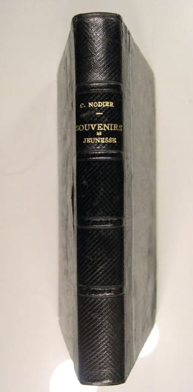 Exemplaire sous reliure aux armes du Maréchal Certain de Canrobert. ''Nodier se renferme ici dans son coeur, s'arrête et se repose au milieu de sa vie, comme pour évoquer, en les embellissant encore, tous les enchantements de sa jeunesse. Ol semble que dans ces pages, où l'on sent battre son coeur, il ait recueilli et fixé ses plus vives émotions, ses joies les plus douces et les plus sérieuses ; il semble qu'il ait prodigué ses plus fraîches couleurs pour peindre ces portraits charmants''. Ors du dos légèrement oxydés ; lequel présente en outre de discrets frottements. Présence de quelques rousseurs dans le corps d'ouvrage ; davantage marquées sur quelques feuillets. Du reste, bonne condition.