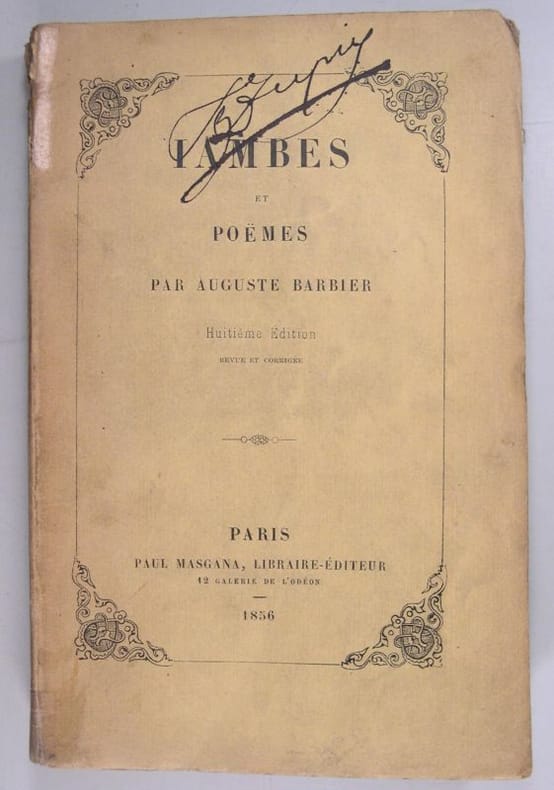 "Henri-Auguste Barbier, né à Paris le 28 avril 1805 et mort à Nice le 13 février 18821, est un poète français, également nouvelliste, mémorialiste, librettiste, critique d'art et traducteur.Il fit ses études au lycée Henri-IV et étudia pendant quelque temps le droit. Il débuta après les journées de juillet 1830 avec Curée, poème satirique et rythmé, qui fut bien accueilli à l'époque. Il est connu surtout pour ses Iambes, poèmes satiriques inspirés par les « Trois Glorieuses ». Il entreprend plusieurs voyages en Italie : en 1832, en compagnie d'Auguste Brizeux (1803-1858), du second, il laissera des Notes d'une tournée aux environs de Rome, à Rome et à Florence, en 1838, le troisième le conduira à Turin et à Florence. Il est élu à l'Académie française le 29 avril 1869 au quatrième tour de scrutin par 18 voix contre 14 obtenues par Théophile Gautier. Ce résultat provoqua un scandale et la violente colère de la princesse Mathilde soutien inconditionnel de Gautier"
