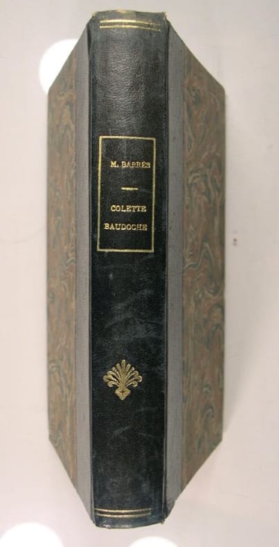 Maurice Barrès, Colette Baudoche - Histoire d'une jeune fille de Metz. Paris, Emile-Paul frère, 1913. In-12, 264p. Nouvelle édition de cet important ouvrage de Barrès, exemplaire sur japon « tiré spécialement pour l'auteur » enrichi d'un long et bel envoi à Mademoiselle Marie Leconte : « A Mademoiselle Marie Leconte, que je vois en train de créer, avec tout son art et tout son cour, une Colette Baudoche pieuse et sérieuse, faible et brave, plébéienne et très noble, hommage d'admiration et d'amitiés, Maurice Barrès. 2 mai 1915 ». Cet envoi est intéressant car Anne-Marie Lacombe, dite Marie Leconte (1869-1947) est l'actrice qui créa le rôle de Colette Baudoche dans l'adaptation théâtrale à la Comédie Française le 8 mai 1915, quelques jours après cette dédicace. Cette adaptation est signée de Pierre Frondaie. Exemplaire enrichi d'une intéressant L.A.S., sd [années 1910], 1p in-4, à l'acteur Georges Pally (1886-1954). Il est question d'une démarche similaire que Pally veut faire auprès d'un général et Barrès et Enrique Larreta auprès d'un autre général. Il propose de voir pour s'associer. Reliure signée Esther Founès, plein chagrin janséniste bleu nuit, dos à nerfs, tête dorée, couvertures et dos conservés. Mors craquelés. Intéressant exemplaire.