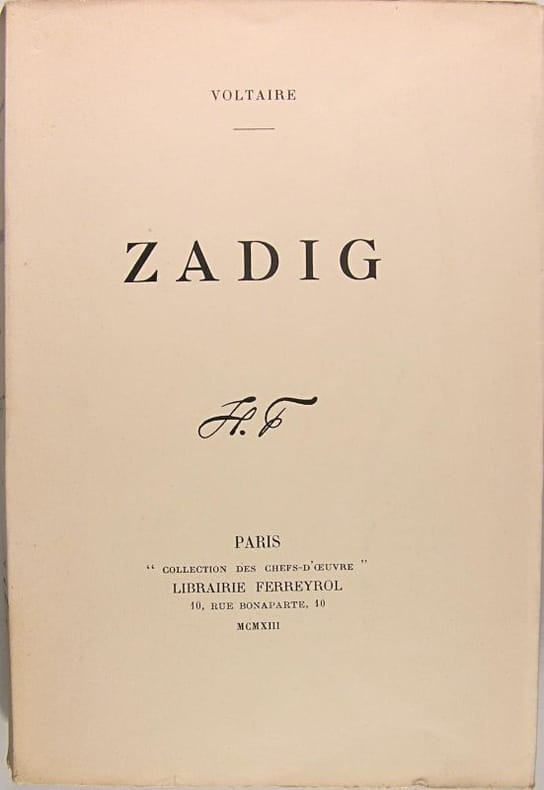 Soigneuse réalisation. Un des exemplaires du tirage numéroté sur vélin de Rives. Il s'agrémente - ici en premier tirage - de spirituelles compositions en couleurs de Roger Mauge. ''Dans ce siècle du voyage et de la philosophie, Zadig entreprend son apprentissage dans un univers partagé entre le bien et le mal. Trahi par Sémire et Azora, déçu par l'amour, Zadig trouve refuge dans la nature, qui est à l'image de Dieu. Remarqué par le roi d'Égypte Moabdar, il retourne dans le tourbillon du monde et devient Premier ministre. Séduit par la reine Astarté et menacé par la jalousie du roi, il fuit bientôt Babylone. C'est l'occasion pour lui d'un retour sur soi et d'une réflexion sur les caprices de la fatalité. Au hasard des aventures qu'il croise sur son chemin en compagnie de l'ermite, Zadig devient l'incarnation de la Providence, dont les voies restent par ailleurs impénétrables. L'ange Jesrad lui révélera une partie des mystères de la Destinée. Si l'homme est sans cesse tiraillé entre liberté et déterminisme, il semble bien devoir les concilier. Et c'est là sans doute la seule vérité qui nous soit accessible.'' Légers défauts affectant les coupes de l'étui. Du reste, très belle condition.