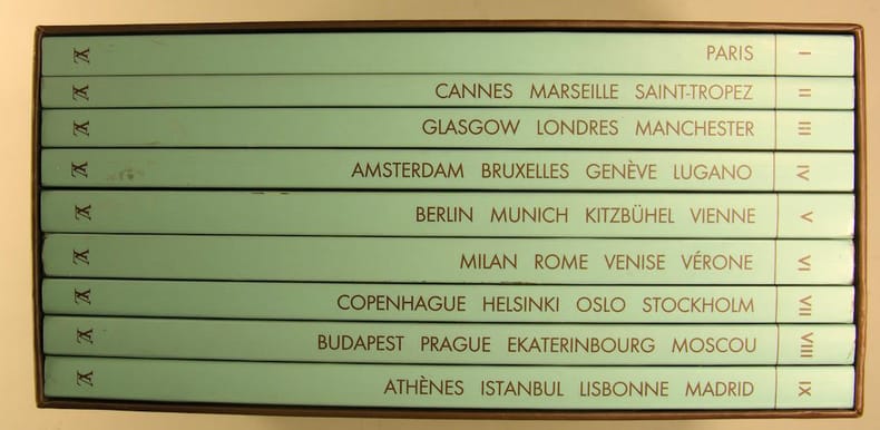 Louis Vuitton, 2013, coffret de 9 volumes broché sous étuis, in/8, 235p ; 167p ; 217p ; 213p ; 251p ; 249p ; 199p ; 225p ; 245 pages. Livret I : ParisLivret II : Cannes – Marseille – Saint TropezLivret III : Glasgow – Londres – ManchesterLivret IV : Amsterdam – Bruxelles – Genève – LuganoLivret V : Berlin – Munich - Kitzbuhel – VienneLivret VI : Milan - Rome – Venise - VéroneLivret VII : Copenhague - Helsinki - Oslo StockholmLivret VIII : Budapest – Prague – Ekaterinbourg - MoscouLivret IX : Athènes – Istanbul – Lisbonne - Madrid