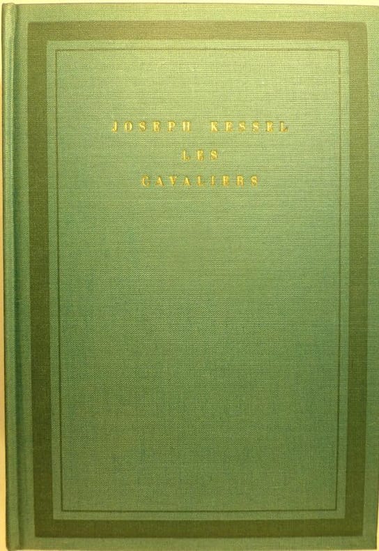 « On arrivait aux approches du Chibar, seule trouée dans le massif auguste et monstrueux de l'Hindou Kouch, par où, à 3 500 mètres d'altitude, se faisait tout le trafic et tout le charroi entre l'Afghanistan du Sud et l'Afghanistan du Nord. » Le début des Cavaliers est une photographie du paysage. C'est parce qu'il méditait de retrouver les paysages de son enfance, les steppes de l'Asie centrale, et parce qu'il lui était interdit de se rendre en Union soviétique, que Joseph Kessel entreprit de visiter l'Afghanistan. Il trouva, au début de l'année 1956, l'occasion de rendre ce périple fructueux : une équipe de tournage, composée des cinéastes Pierre Shoendoerffer et Raoul Coutard, est prête à réaliser un film qu'il écrirait sur place, au fur et à mesure. Cette équipée afghane mériterait un livre entier, dont Kessel donnera un aperçu dans Le Jeu du roi, journal de bord du film en train de se faire et premières lignes d'où jailliront un jour Les Cavaliers, « son roman le plus abouti, le plus lyrique. Il mettra plusieurs années à l'écrire ce roman où pour la première fois un auteur découvrait au monde occidental les paysages des contreforts de l'Hindou-Kouch, les cavaliers tadjik, le jeu du bouzkachi et les bouddhas géants de Bamiyam. Il inventera une petite créature femelle, particulièrement dangereuse, pour électriser ses héros à cheval. Née de son imagination, Zéré, la nomade, aura un visage aux traits fins, un regard vert translucide et tous les talents pour damner un homme. La perversité de Zéré, son amour cruel, sa nature maléfique, sa beauté aussi, et l'attraction qu'elle exerce si facilement sur les hommes, ne sont pas sans rappeler, dans la vie de Kessel, les vertus de son épouse irlandaise, Michèle, tout aussi éruptive et armée d'inquiétants pouvoirs (...) Le roman ne sera publié qu'en 1967. Sa genèse aura duré dix ans, son écriture un peu plus de six - presque un record pour Kessel qui, à l'exception du Tour du malheur, écrit ses livres en un tournemain.» (Dominique Bona, in Les Partisans). La Passe du diable, le film réalisé, sortit le 21 mai 1958 dans une seule salle des Champs-Elysées, et sans publicité. Mais en 1967, un succès sans égal accueillera Les Cavaliers dont le bandeau à parution titrait à raison : « Le Roman lointain de Kessel », tant l'équipée afghane de Kessel est flamboyante et admirable. Si Le Tour du malheur est son pendant biographique, Les Cavaliers forment l'agrégat parfait du Kessel aventurier. Jacqueline Breitel, secrétaire de Joseph Kessel, expliquera au prix de quel effort il avait composé son roman : « Chaque jour il me confiait les écrits de la veille (...) Je lui apportais une frappe bien propre et le lendemain, outre les demi-feuilles manuscrites, il me la rendait raturée à plus de la moitié. J'estime qu'il a réécrit Les Cavaliers quatre ou cinq fois. Au moins ! Lorsqu'il reçoit le manuscrit de huit cents feuillets sur sa table, Gaston Gallimard est aux anges : il estime qu'il s'agit là du meilleur roman de son poulain depuis L'Équipage, achevé quarante-trois ans plus tôt» (in Dictionnaire amoureux de Kessel). Le roman a remporté un immense succès tant public que critique : un hommage unanime et pour une fois sans fausses notes que peu d'écrivains peuvent se vanter de recevoir. Kessel en est heureux. Ces Cavaliers, son quatorzième roman, sera aussi le dernier qu'il écrira, et tout lui sourit - en tout cas sur le front des ses oeuvres : Bunuel vient d'acquérir le droit pour Belle de jour, et Les Cavaliers font l'objet d'une course frénétique entre les studios américains : c'est finalement la Columbia Pictures qui l'emporte, pour la somme colossale de cent millions d'anciens francs. John Frankenheimer dirigera les opérations et offrira les rôles du jeune Ouroz et du vieux Toursène à Omar Sharif et à Jack Palance. Pour Omar Sharif, cavalier hors pair, fasciné par le monde des chevaux, c'est un rôle en or, après Ali, prince du désert, qui a été le sien dans le Lawrence d'Arabie de David Lean, sorti cinq ans plus tôt. Précieux exemplaire offert nominatif pour Maurice Dron, lequel fera son entrée sous la coupole de l'Académie française quelques mois après la parution des Cavaliers. Il en est alors le benjamin et prend place à quelques sièges de son oncle, en habit vert depuis 1962. Druon en deviendra le doyen, quarante-deux ans plus tard, après en avoir été le Secrétaire perpétuel de 1985 à 1999. Le 24 novembre 1967, il reçoit son épée des mains de Kessel, à la Maison de l'Amérique latine et, le 7 décembre, il est reçu sous la coupole. Le 11 août 1971, Maurice Druon accompagne Joseph Kessel, qui d'habitude n'aime pas voir ses romans portés sur grand écran, sur les grands boulevards, pour la première du film : les deux hommes pourront s'émouvoir devant des images prodigieuses. Frankenheimer a tourné la plupart des scènes, et notamment le bouzkachi, dans les montagnes et les vallées d'Afghanistan,au pays de coeur de Kessel que ne connaît pas Druon mais que son oncle, cent fois, lui a raconté. De la bibliothèque Maurice Druon (ex-libris) et justification nominative. La reliure est au chiffre «M.D.» en pied des volumes, dans une parfaite et remarquable reliure d'Alix, à l'identique des plus précieux exemplaires établis et conservés ainsi par Druon : Le Tour du malheur (1950), Le Lion (1958, pour deux volumes) et ces Cavaliers. Seuls ces trois titres de Kessel ont eu droit à ce traitement de faveur, preuve de l'importance que Druon leur portait. On connaît, sur ce papier, les exemplaires nominatifs de Patrick Kessel, Gérard Bon, Albert Mermoud, Roger Grenier, Gaston Gallimard, Claude Gallimard, André Varay, André Andrée Mallet-Stevens, Charles Gombault, Paul Guilbert, Georges Walter. Aucun d'entre eux ne porte d'envoi : ces exemplaires nominatifs ont tout simplement été diffusés et rendus disponibles à un mom