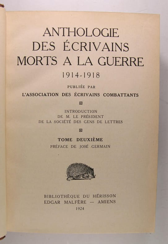 Bibliothèque du Hérisson, Edgar Malfère, tome II, Amiens 1924, in/8, de XI. .; 786 pages, reliure en demi-chagrin marron, pièce de titre. Introduction de Georges Lecomte, pface de José Germain.
