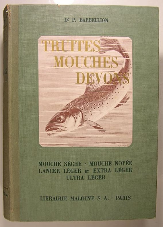 Librairie Maloine, Paris, 1948 1 fort volume grand in-8 (28 x 20,5 cm) de 1.181-(1) pages. Très nombreuses illustrations dans le texte et hors-texte en noir et blanc, figures techniques, schémas, reproductions de photographies. Reliure pleine toile verte éditeur, premier plat de couverture avec étiquette imprimée 14 x 12 cm contrecollée (truite avec titre doré), le tout en excellent état de conservation. Intérieur comme neuf. Beau papier satiné de qualité. Quelques infimes plis marqués aux coiffes. Édition originale. Il a été tiré en outre 350 exemplaires sur papier couché. Véritable bible du pêcheur de la truite à la mouche et au lancer léger, ce monumental ouvrage est l'oeuvre d'un pur passionné. Tout y est méticuleusement et précisément présenté : matériel, techniques, sensations, même l'écologie est largement présente dans ce superbe volume très recherché des collectionneurs-pêcheurs. C'est avec La Truite d'A. Vavon (1926), l'autre livre indispensable et incontournable qui doit être présent dans toute bibliothèque halieutique. Ouvrage riche de 52 illustrations hors-texte dont 34 planches photographiques en noir et 2 planches couleurs présentant des mouches artificielles, avec de très nombreuses figures techniques. Ce volume, relié sur un exemplaire broché à l'état de neuf, possède son premier plat de couverture (le seul illustré) en parfait état, ce qui est notablement rarissime pour cet ouvrage. Il n'est pas rare de trouver cet ouvrage dans un état médiocre ou passable, dans un superbe état de fraîcheur tel qu'ici c'est une autre histoire ... Superbe exemplaire resté très frais dans sa reliure éditeur pleine toile décorée.