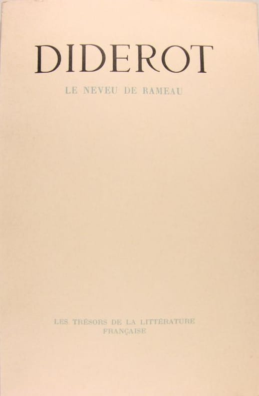 Véritable édition originale française du Neveu de Rameau. En Français dans le texte, n° 153. A Paris, chez J. L. J. Brière, 1821.In-8 de (4) pp., (1) f., xxvii pp., 148 pp. (Le Neveu de Rameau), [149]-322 pp. (Voyage de Hollande), [323]- 383 pp. (Correspondance), [384]-388 pp. (Table). Exemplaire relié sans la Table des ouvrages de Diderot. Relié en percaline brune de la fin du XIXème siècle. 216 x 134 mm.