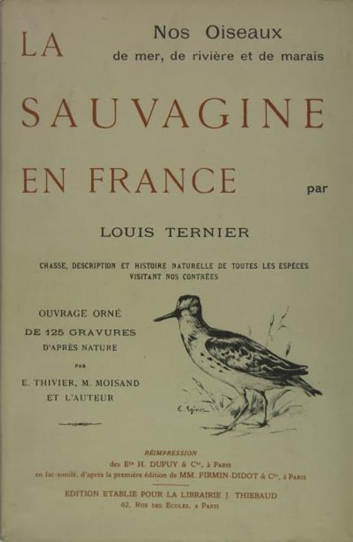 Troisième réimpression anastatique de ce livre paru d'abord en 1897 et qui fut tout de suite une référence ornithologique. La première réimpression, de médiocre qualité, était sortie en 1922, puis il y eut le tirage amélioré de 1929, sur lequel est fait le nôtre.L'avocat Louis Ternier (1861-1943) était un passionné de la chasse au gibier d'eau. Entré en 1905 à la Société d’acclimatation, co-fondateur en 1909 de la Revue française d’ornithologie, il s’occupa de toutes les questions qui ont trait à la chasse, que ce soit au niveau national ou international, et défendit très tôt l’idée d’une protection internationale des oiseaux migrateurs et celle d’une limitation des prélèvements. Ce fut aussi un des initiateurs de la LPO. Vice-président fondateur, il succéda à Magaud d’Aubusson comme président de 1917 à 1921.Thiébaud, Supplément, 1258. - - VENTE PAR CORRESPONDANCE UNIQUEMENT