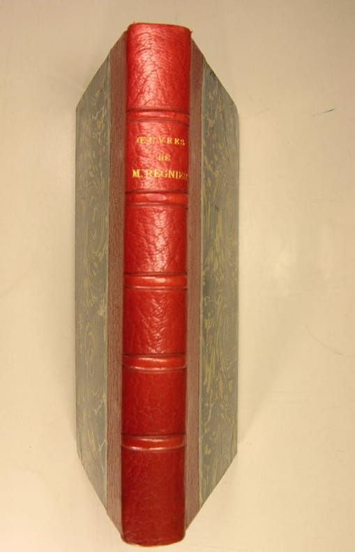 Paris Chez Th. Desoer, Libraire 1822 in 12 (14,5x8,5) 1 volume reliure plein veau lisse violine à long grain, roulette d'encadrement estampée à froid sur les plats avec un grand fleuron central estampé à froid, dos à nerfs orné de roulettes dorées et de fleurons estampés à froid, roulette dorée intérieure, roulette dorée sur les coupes, XLVIII et 402 pages [1], quelques petites rousseurs claires éparses sur les premiers cahiers. Reliure attribuable à l'atelier R. P. Gout. Gout et son fils étaient relieurs établis à Montpellier, place Notre-Dame, au milieu du XIXe siècle. Gout fils fut relieur et laveur de livres. Il trouva des procédés pour rendre au papier sa blancheur première sans en altérer la substance, et reçut pour cela une récompense à l'Exposition universelle de 1855. Mathurin Régnier, Chartres, 1573 - Rouen 1613, poète satirique français. Bel exemplaire, fine reliure romantique issue du meilleur atelier installé à Montpellier au XIXe siècle. Bel exemplaire, reliure très fraîche