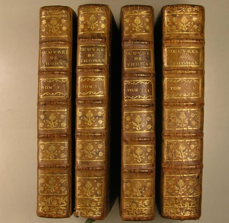 A Amsterdam, chez Moutard, librairie de madame la Dauphine, rue Hurepoix, à S. Amboise, 1773, nouvelle édition, revue, corrigée et augmentée. Quatre volumes in/12, dans une reliure d'époque en pleine basane marbrée, dos ornés à nerfs, tranches jaspées. Tome I : 426 pages ; Tome II : 410 pages ; Tome III: 433 pages. Tome IV : Essai sur le caractère, les moeurs et l'esprit des femmes, seconde édition 1772, 371 pages, 214 pages.