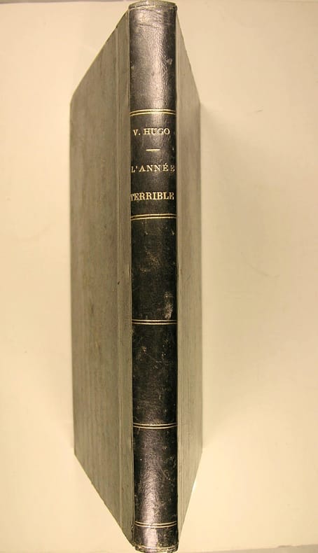 Edition en partie originale et ''première édition définitive''. (in Le Quillec). Exemplaire sous reliure signée Ed. Laügt à Pau. ''Carnage, sang et épouvanteS règnent dans L'Année terrible. Hugo se montre conscient d'une graduation dans les formes de la violence, comme si, à mesure que la société française s'approchait du but, les formes prises par la violence s'exacerbaient. ''L'avenir est un monstre avant d'être un archange''., Mais il ne délaisse pas ici l'analyse sociale. De même que, très vite, l'analyse politique ressurgit ; défense de la République et de la Révolution. Mais la violence paroxystique de L'Année terrible est constatée par Hugo comme faisant partie des hors-normes : temps de dérèglement, où l'esprit s'efface devant l'instinct, d'où la nécessité de réaffirmer qu'au dessus de l'un et de l'autre surnage ce principe supérieur : le droit. Or, affirme Hugo, dans la France de 1871, ''la loi opprime le droit''. Dès 1830, Hugo avait résumé en une formule forte son sentiment sur les rapports du pouvoir, du droit et de la violence : ''En matière de pouvoir, toutes les fois que le fait n'a pas besoin d'être violent pour être, le fait est droit''. (Jean-Claude Caron). Carteret I, Le Trésor du bibliophile romantique et moderne, p. 423 - Clouzot, Guide du bibliophile français, p. 92 - Vicaire IV, Manuel de l'amateur de livres du XIXème, 344 - Rahir, La Bibliothèque de l'amateur / Guide des livres les plus estimés, p. 465 (pour l'originale de 1872) - Le Quillec, Bibliographie critique de la Commune de Paris, 1237. Quelques frottements affectant le papier marbré des plats. Un mors fendillé (sans conséquence). Coiffe supérieure arasée. Feuillets légèrement oxydés. Présence de quelques rousseurs dans le corps d'ouvrage. Du reste, belle condition.