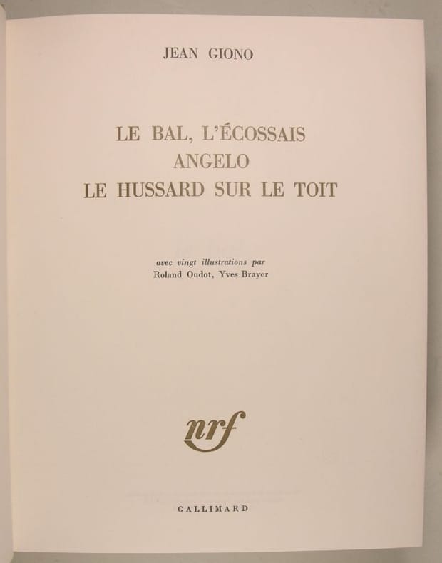 Paris Gallimard 1965 1 vol. relié in-4, cartonnage d'éditeur d'après la maquette de Hollenstein, rhodoïd, 578 pp. Edition collective illustrée de 20 compositions par Brayer pour le Hussard sur le toit et par Oudot pour les trois autres titres (Huret, 220). En bon état (déchirure au rhodoïd).