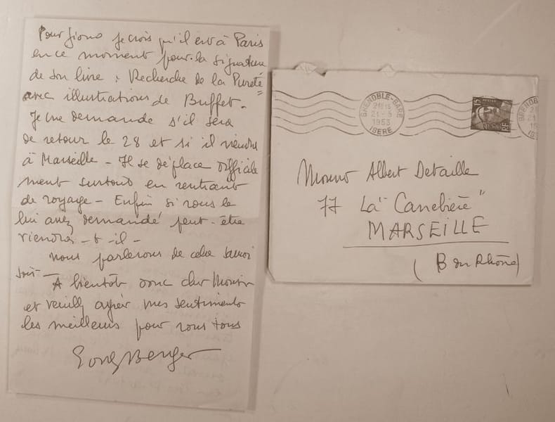 Jean Giono (Manosque , 30 mars 1895 - Manosque, 8 octobre 1970) écrivain français, d'une famille d'origine piémontaise, dont l'oeuvre romanesque a en grande partie pour cadre le monde paysan provençal. Inspirée par son imagination et ses visions de la Grèce antique, elle dépeint la condition de l'Homme dans le monde. Il devint l'ami de Lucien Jacques, d'André Gide et de Jean Guéhenno, BERGER Edith, ainsi que du peintre Gimel. Il resta néanmoins en marge de tous les courants de littérature de son temps.Née le 28 novembre 1900 à Grenoble, elle est la cadette d’une famille de six enfants. Elève des Arts décoratifs et industriels de Grenoble (1917 – 1918), puis de l’Ecole des Beaux-Arts de Lyon en 1919, elle suit de 1920 à 1924 les cours de l’Académie de peinture « La Grande Chaumière » à Paris. En 1926, atteinte de tuberculose, elle doit rentrer à Grenoble. Elle découvre le Trièves en 1920 alors qu’elle rentre d’un voyage à Saint-Tropez. Son oeuvre est très étroitement liée au Trièves où elle a puisé l’essentiel de son inspiration. Edith Berger avait lu « Colline » et « Un de Baumugne » et rêvait de rencontrer Jean Giono. En 1931, elle rend visite à l’écrivain à Manosque. Ils se lient rapidement d'amitié et leurs rencontres sont toujours l'occasion de parler littérature, peinture ou musique. Elle lui soumettra même un manuscrit tandis que lui s’essaiera à la peinture.