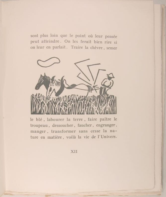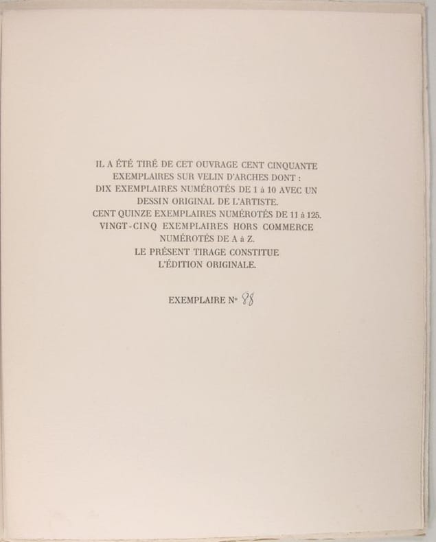 Paris, 1950. In/4 en feuilles sous chemise cartonnée et étui, illustré par Edith Berger : linogravures en noir in-texte. Edition originale. Joint une lettre d'Edith Berger chez le galeriste Albert Detaille. N° 88 des 115 exemplaires numérotés.