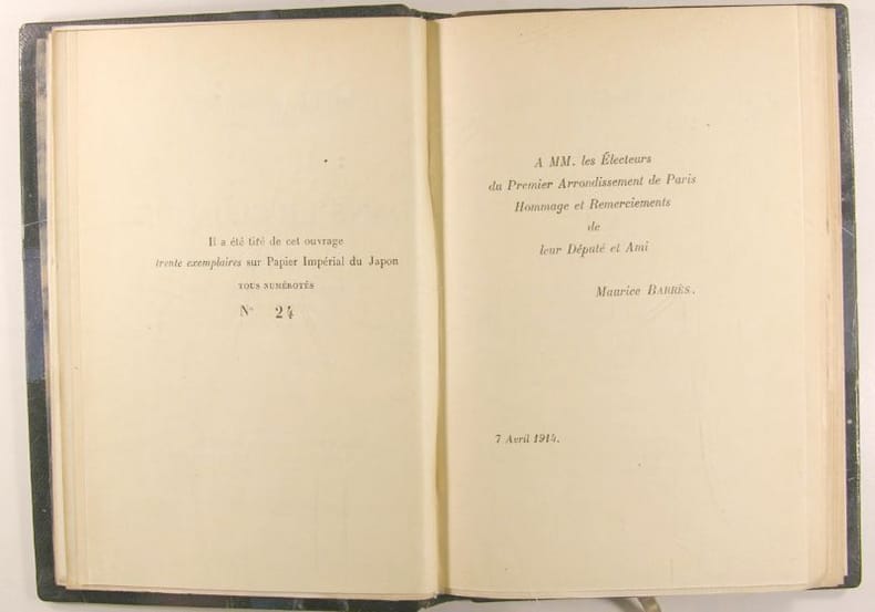 Paris Emile-Paul Frères, éditeur, 1914, in/8, 115 pages, le dos et les couvertures conservées, reliure demi-maroquin, dos à nerfs, coins, 414 pages + table des matières. Tirage 30 exemplaires sur papier impérial du Japon, N° 24.