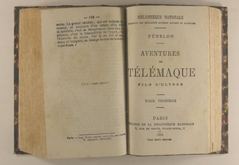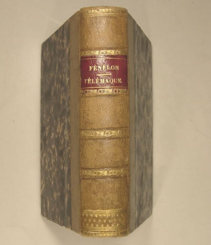 Un ouvrage à visée pédagogique. Les Aventures de Télémaque furent écrites par Fénelon (Sainte-Modane, 1651-Cambrai, 1715) pour servir à l'enseignement du duc de Bourgogne. Il s'agissait de faire connaître au futur souverain, petit-fils de Louis XIV, la culture Antique qui imprégnait alors toute la civilisation moderne. Et de lui donner, à travers l'histoire d'Ulysse et de son fils Télémaque, une formation morale et politique, lui enseigner l'art de régner et de faire prospérer un royaume. Les Aventures s'inscrivent dans la lignée de son Traité de l'éduction des filles (rédigé en 1681), lorsqu'il est directeur de l'Institut des Nouvelles Catholiques, internat parisien. Le texte, publié en 1699 à l'insu de l'auteur, contenait une implicite critique de l'absolutisme et les plus hauts personnages de la cour ont cru se reconnaître à travers certains portraits satiriques. Malgré sa défense, Fénelon dut quitter la cour. L'ouvrage fut rapidement interdit et diffusé clandestinement dans toute l'Europe. L'édition du libraire-bibliophile Renouard. Cette édition fut imprimée par Pierre Causse à Dijon, sous la direction du libraire Antoine-Augustin Renouard. Elle est ornée d'un titre gravé, avec le portrait de Fénelon par Gaucher d'après Vivien en médaillon. L'ouvrage, d'une très belle qualité typographique, est imprimé sur papier vélin. Il fut tiré à 265 exemplaires, dont 240 furent immédiatement achetés par le baron de Lunas pour employer des assignats. Ceux-ci ne réapparaîtront qu'en 1817, à la vente des livres de feu le baron. Cet ouvrage est donc d'une rareté extrême en reliure de l'époque comme ici. Antoine-Augustin Renouard (1765-1853) prit une part active aux débuts de la Révolution. Électeur de 1791 et 1792, il est membre du conseil général de la Commune de paris et commissaire civil en 1793. C'est vers cette date qu'il commence à publier des éditions d'ouvrages classiques qui se font remarquer par leur élégance et leur correction. Arrêté puis libéré en 1794 et 1795, Renouard sera breveté libraire en 1812. Il se retire en 1825. Il sera maire du 11e arrondissement (actuel 6e) quelques années. Collectionneur et bibliophile, il est également l'auteur de nombreux ouvrages de bibliographie, dont les Annales de l'imprimerie des Alde (1803-1812), Catalogue de la bibliothèque d'un amateur (1819), Annales de l'imprimerie des Estienne (1837). Pierre Causse (1761-1834) succéda en 1788 à son père Jacques (1725-1802), imprimeur du parlement de Bourgogne et de l'académie des sciences de Dijon. Sa carrière d'imprimeur-libraire s'arrête en 1795, date à laquelle il confie son imprimerie à Jean-Pierre Moroge et se lance dans la politique. Superbe exemplaire en maroquin à dentelle de l'époque. Renouard, Catalogue de la bibliothèque d'un amateur, II, p. 209 ; Graesse, Trésor de livres rares et précieux, II, p. 565 ; Mellot et Queval, Répertoire d’imprimeurs/libraires XVIe-XVIIIe siècle, n°879 et 3205.