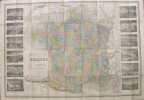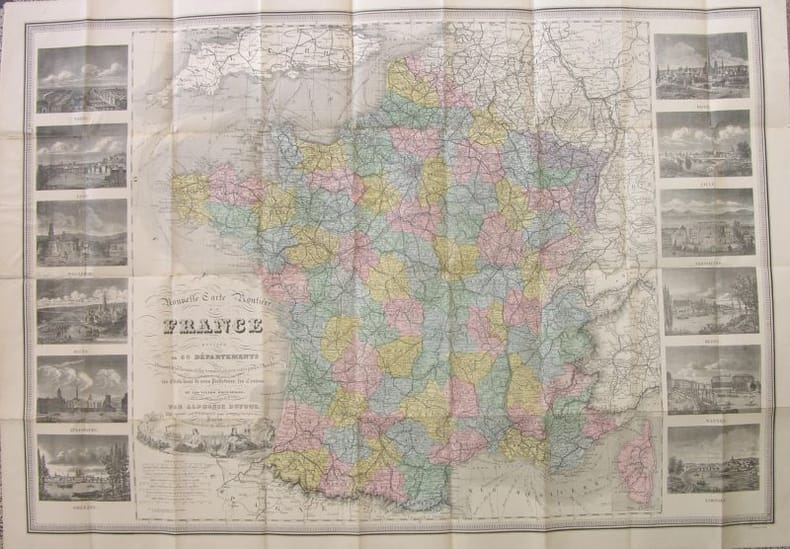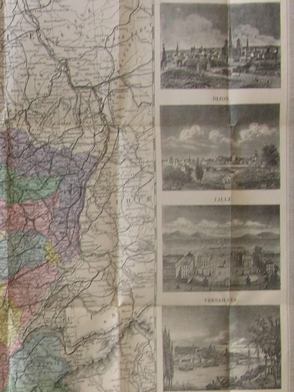 Paris Bernardin-Béchet et Fils, éditeur, 31 quai des Grands-Augustins, sans date vers 1880. Carte revue et augmentée par Lallemand géographe, divisée en 86 départements donnant les chemins de fer terminés et ceux votés par les chambres, avec toutes les voies de communication des chem. de fer des États limitrophes, les chefs lieux de sous préfectures, les cantons et les villes principales avec les Archevêchés et Évêchés. Carte dépliante, avec sa reliure d'origine, plat illustré en couleur de 89 cm x 63 cm. Carte avec de chaque côté 12 gravures de ville : Paris, Lyon, Marseille, Rouen, Strasbourg, Orléans, Dijon, Lille, Versailles, Blois, Nantes, Limoges.