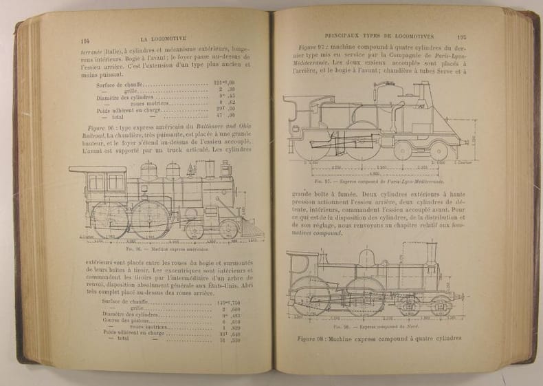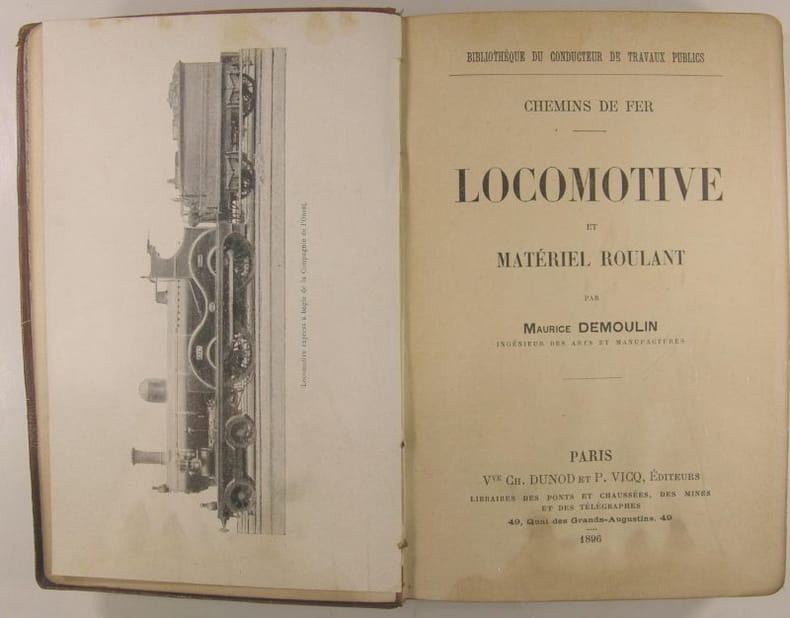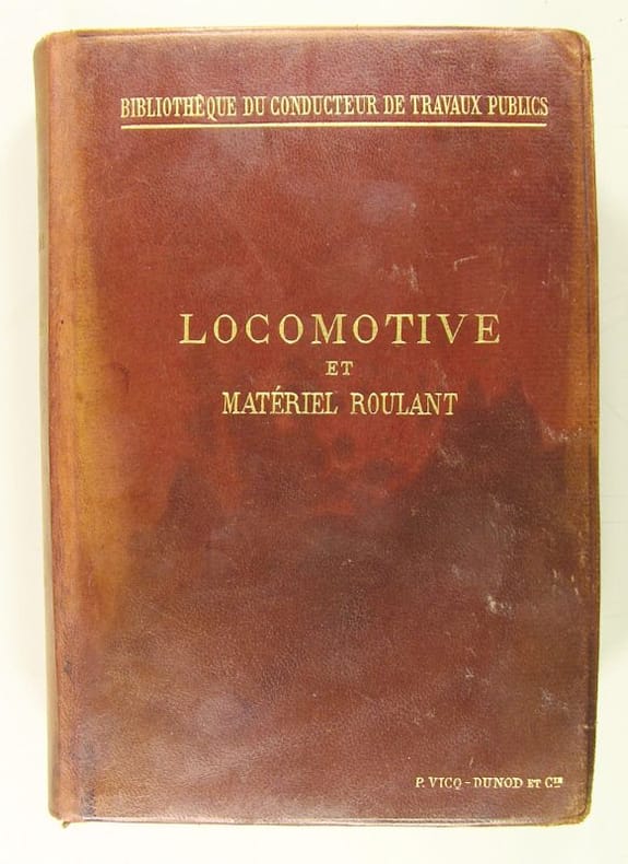 "Bibliothèque du conducteur de travaux publics--Auteur Maurice DEMOULIN, ingénieur des arts et manufactures--Première partie : La locomotive //Considérations générales, la chaudière, le mécanisme, le véhicule, le tender et la locomotive-tender, principaux types de locomotives, description de quelques locomotives de construction récente, les locomotives compound---Deuxième partie : Le matériel roulant / Considérations générales, construction des voitures et des wagons, description de quelques types de voitures, les freins--Total de 402 pages--De nombreuses figures et des planches dépliantes--Edition Vve Ch DUNOD et p VICQ en 1896--Couverture cuir-En bon état