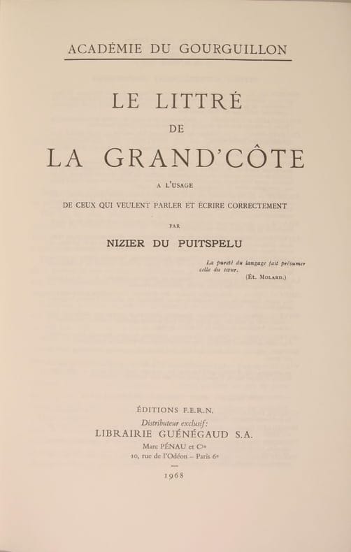 Le parler lyonnais est une forme de français régional dont les tournures sont influencées par l’héritage franco provençal. C’est Clair Tisseur (architecte lyonnais, 1827-1895), alias Nizier de Puitspelu, qui consacra l’automne de sa vie à la rédaction de « la Bible du parler lyonnais », savant dictionnaire étymologique qui allait devenir l’extraordinaire « Littré de la Grand’Côte ». La première édition parut en 1894, il est toujours aujourd’hui un trésor d’érudition, de finesse, et d’humour le livre de chevet par excellence de tout bon gone ! Si les mots du parler lyonnais sont aujourd’hui peu employés, un brin désuet pour certains, il n’en reste pas moins qu’ils sont à la manière des lyonnais « narquois, gaudisseurs, sans-souci, rêveurs... un peu bizarres ». En vagabondant au hasard de ces pages nonchalantes, on pourra aussi bien reconstituer tout un repas lyonnais, autrement dit un mâchon. Faute de pécuniaux, le mâchon peut se réduire à de simples mate-faims. Mais, pour Gnafron, ce puits perdu, ce buvantin si fort porté sur la chopination, ce qui importe avant tout, c'est le pot de beaujolais, qui descend bien dans le corgnolon tout en montant au coqueluchon. Tant pis s'il faut rentrer chez la fenotte à des heures induses, en tenant ses grolles entre le gros det et le laridet... De toute façon il faudra cigogner la porte. Nizier du Puitspelu et ce « Littré de la Grand'Côte » font indiscutablement partie du patrimoine lyonnais.
