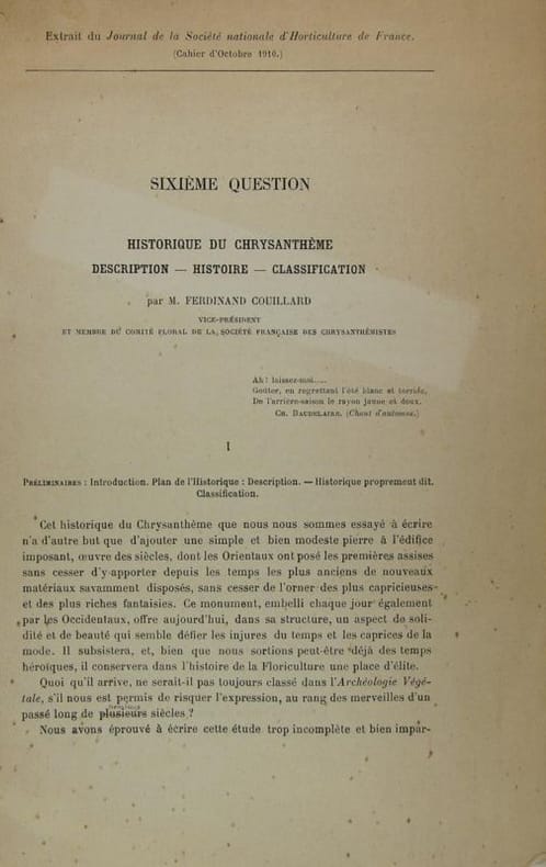 Extrait du journal de la société nationale d’horticulture de France - 6ème question du cahier d’octobre 1910. historique du chrysanthème, description, histoire et classification - grande médaille d’ordu congrès international des chrysanthèmistes du 5 novembre 1910.Dédicace de l’auteur.