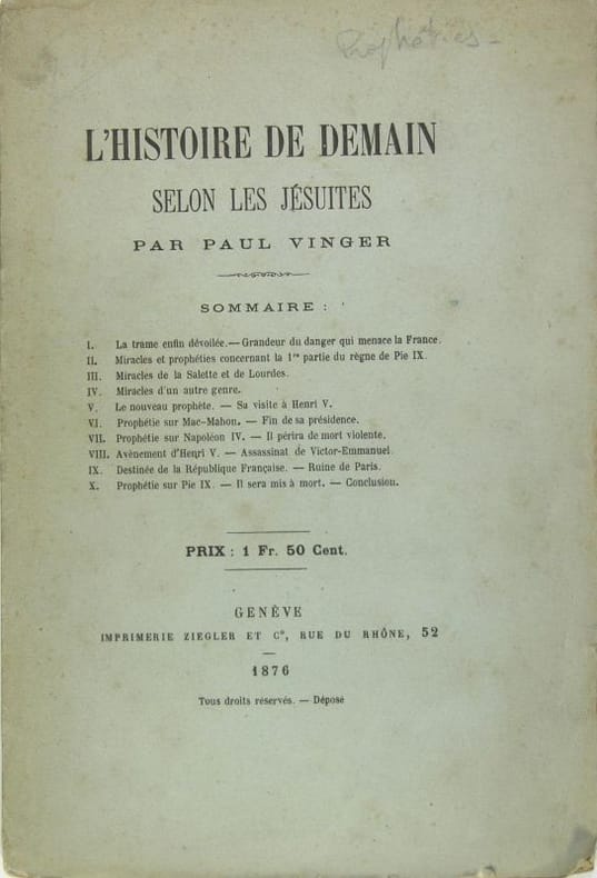 La trame enfin dévoilée, grandeur du danger qui menace la France - Miracles et prophéties concernant la 1 ère partie du règle de Pie IX - Miracles de la Salette et de Lourdes - Miracles d’un autre genre - Le nouveau prophète, sa visite à Henri V - Prophétie sur Mac-Mahon, fin de sa présidence - Prophétie sur Napoléon IV, il périra de mort violente - Avènement d’Henri V, assassinat de Victor-Emmanuel - Destinée de la République Française, ruine de Paris - Prophétie sur Pie IX, il sera mis à mort, conclusion.