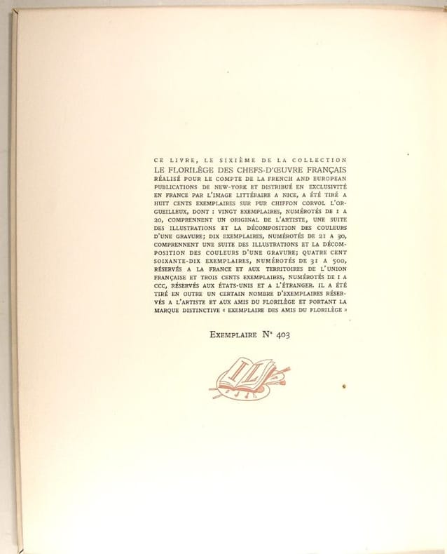 Editions de la Maison Française, Paris, 1948. In/4 couverture imprimée rempliée, sous chemise cartonnée et emboîtage, (Emboîtage avec menus défauts). illustrations de S. Sauvage gravée sur bois par G. Angiolini, 181 pages. Exemplaire numéroté sur pur chiffon Corvol l’Orgueilleux.