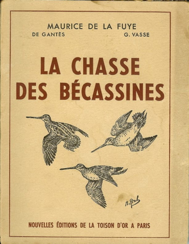 # AUTEUR: De la Fuye Maurice - De Gantès et Guillaume Vasse # ILLUSTRATEUR: De Lajarrige L. # ÉDITEUR: Duguet R. Blois # ANNÉE ÉDITION: 1922 # COUVERTURE: Imprimée illustrée - en couleurs - dos plat titre en long # DÉTAILS: Grand in 8° broché 3ff + XVIII + 292pp + 2ff. 8 hors-texte d'illustrations photographiques dont 3 cartes dépliantes et 18 figures dans le texte. Description-moeurs-migrations, technique, description des marais et caractéristiques de la chasse de la bécassines en diverses régions (Picardie, baie de Somme et de Seine, basse Normandie, Bretagne, Sologne, Champagne, Franche-Comté, ile de Tirée et Maroc-Algérie-Abyssinie-Egypte. Quelques recettes. # PHOTOS visibles sur www.latourinfernal.com