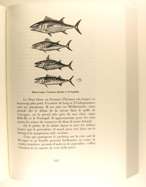 Edition originale tirée à 1080 exemplaires numérotés, n° 543. Texte et très nombreuses figures et planches in-texte en noir d'Oberthür. Précise description de la faune marine, localisation, moeurs et déplacements et techniques de pêche. La dernière partie concerne le poisson dans l'alimentation, séché, fumé et conservé ; la préparation du poisson frais ; les différents modes de cuisson et donne bien sûr d'appétissantes recettes !