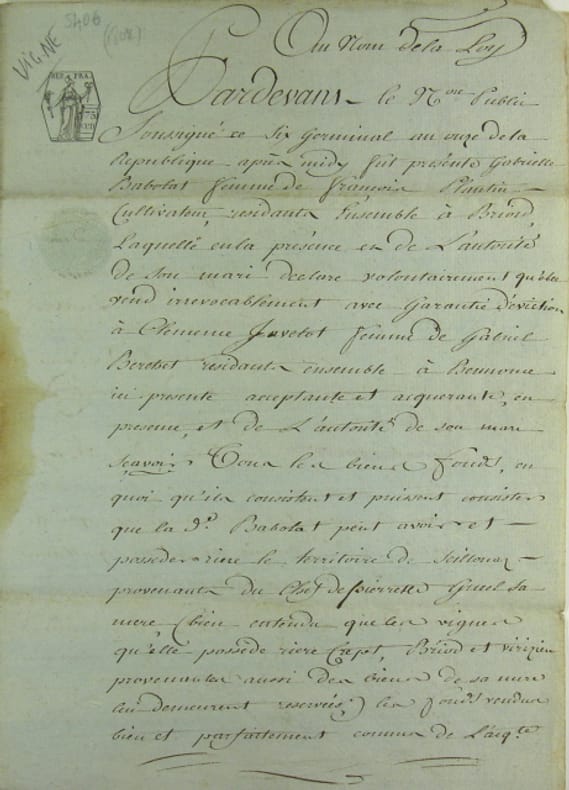 Serrière, le six germinal an 11, feuillet double sur papier bleuté filigrané “timbre national” rédigé à Serrière (Ain) - feuillet double : 29.5 x 21 cm. Tache rousse sur les pliures.