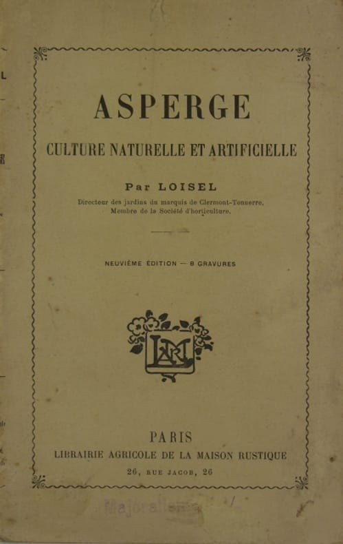 Petit traité sur la culture des asperges (origine, préparation et disposition du terrain, récolte, ennemis des asperges...). Seconde édition Bitting, p. 192 pour l’édition originale. Fermeture de la Librairie du 30/12/2025 au 11/01/2026