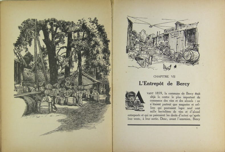 Dessins à la plume de P. Baudier graveur fameux né en 1881. Bercy était autrefois la Halle des vins à Paris, et constituait une “oasis... un refuge charmant”... Oberlé 443.