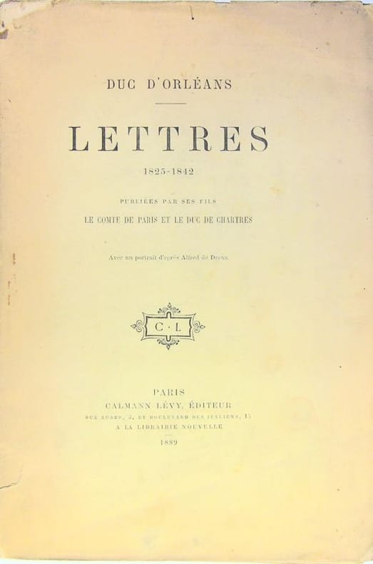 Calmann Lévy, Paris, 1889. In/8 broché couverture imprimée, frontispice, 323 pages. Avec un portrait d'après Alfred de Dreux. Portant tampon avec la mention “de la part des fils du Duc d’Orléans”