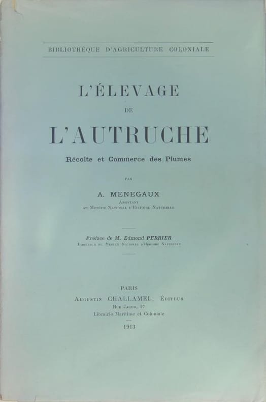 Cet ouvrage fait partie de la collection de la “Bibliothèque d’agriculture coloniale” : l’autruche, les plumages, des plumes usages et points, récolte de plumes, domestication et élevage, extension de cet élevage.