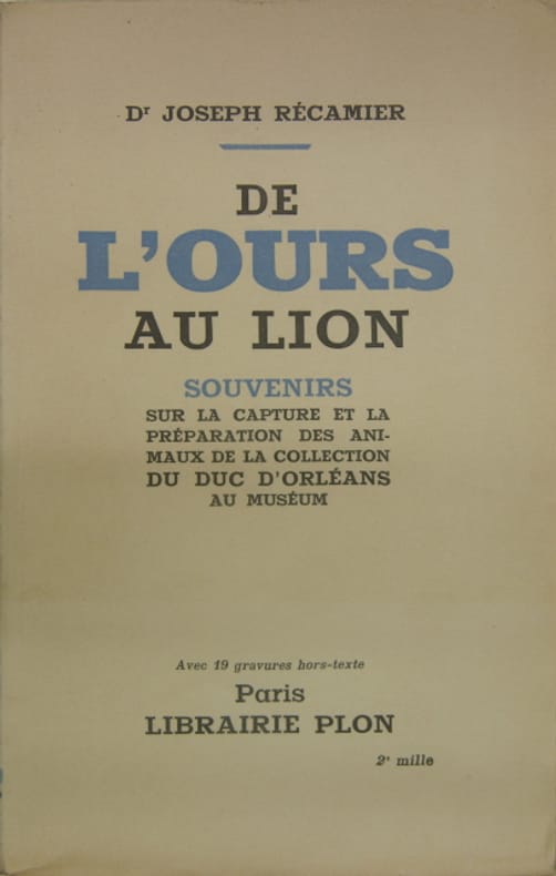 Edition originale sur papier couvrant de ces "souvenirs sur la capture et la préparation des animaux de la collection du Duc d’Orléans au Museum ». Illustré de 19 reproductions photographiques d’animaux sauvages.Exemplaire de Léon Daudet, avec envoi autographe de l’auteur : « à Léon Daudet, modèle de courage et de fidélité, en souvenir du Prince qu’il a servi, très cordial hommage. J; Recamier»Déchirures le long des charnières, dos passé.