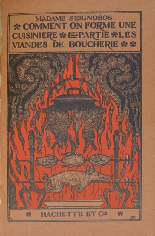 Un utile mémento de la cuisinière sur la durée des cuissons; Le boeuf, le mouton, le veau, le porc frais... et au préalable quelques conseils à la ménagère de 1913 : comment faire son feu, le fourneau au charbon, la cuisine au gaz, comment on devient rôtisseur. Joli couverture conservée en couleur et pages de garde à tête de coqs.