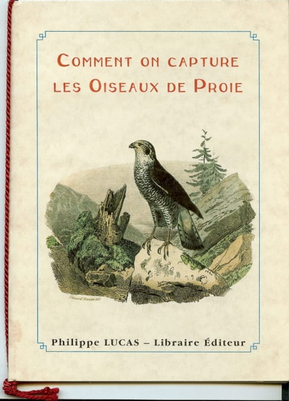 Philippe Lucas, Libraire-Editeur, Lyon, 2000. Plaquette in-8 broché maintenue par une cordelette rouge, couverture illustrée en couleur, 25 pages. Tirage à 200 exemplaires numérotés. Buse, faucon, autour, sont quelques-uns des oiseaux de proie décrits dans cette plaquette. Figures en noir dans le texte. Ces animaux étant aujourd’hui protégés, le texte n’est plus d’actualité mais conserve sa valeur documentaire.