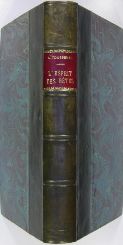 La première édition était parue en 1847, mais avec le sous-titre Vénerie française et zoologie passionnelle, ce qui mettait davantage en relief le rapport du texte avec la chasse, même si une partie des notices concernent les "auxiliaires de l'homme" (chat, chien, cheval, âne, mulet) et les animaux d'élevage.Alphonse Toussenel (1803-1885) avait d'abord vécu à la campagne où il s’adonna à l’agriculture et commença ses observations sur les mœurs des animaux. Puis la lecture solitaire des ouvrages de Charles Fourier l’enthousiasma et il adhéra à la théorie sociétaire. Ses ouvrages sur les animaux se tiennent à égale distance de la zoologie et de la sociologie, dans une démarche où ce que l'on n'appelait pas encore l'éthologie permettait de comprendre les comportements humains.Thiébaud, 904. Mennessier de La Lance II, 577. - - VENTE PAR CORRESPONDANCE UNIQUEMENT