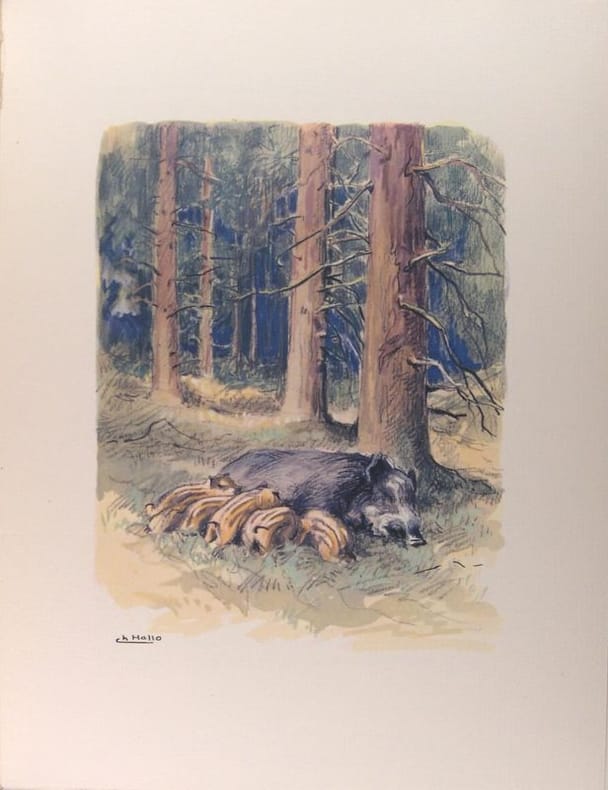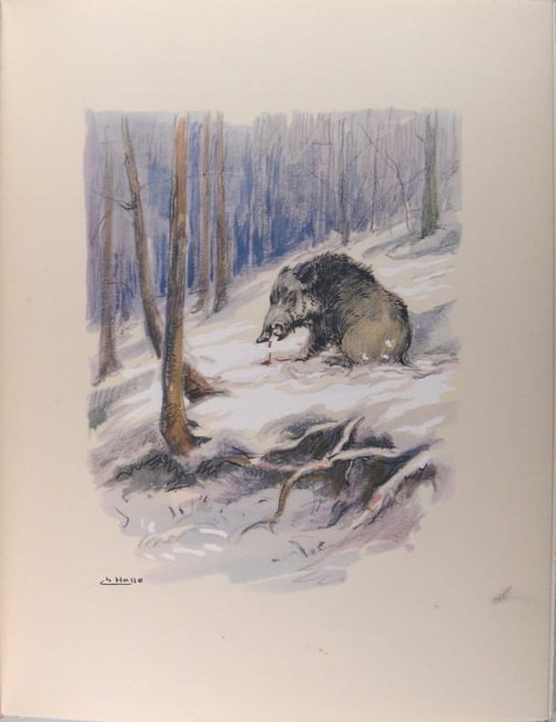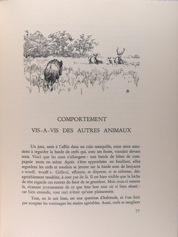 Superbe ouvrage sur le sanglier, le meilleur, et le plus complet. Il étudie avec précision les habitudes, les moeurs et la chasse de ce gibier de plus en plus prisé. Traduction de H. Manhès d’Angeny. Kaps, p. 187.
