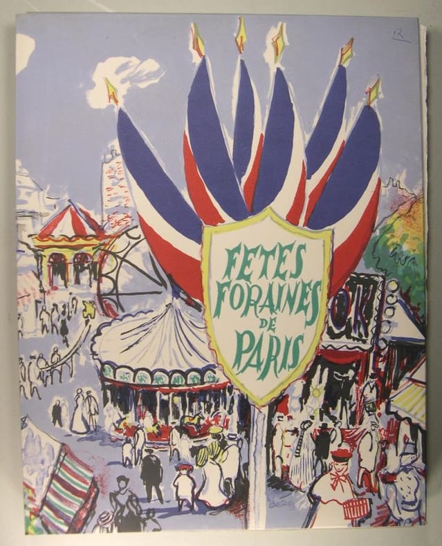 MOUREY (Gabriel).Fêtes foraines de Paris. Lithographies originales en couleurs de Grau Sala.Editions Droin-Labas, Paris, 1947. In-4°, 34 x 26,5 cm, en feuilles sous couverture illustrée, étui & emboitage. 29 lithographies originales de Grau Sala, dont une sur la couverture, un frontispice, 6 hors-texte et 21 in-texte.Tirage limité à 280 exemplaires numérotés sur vélin de Rives. Celui-ci undes 30 exemplaires nominatif signés par l'artiste et réservés aux collaborateurs du livre et enrichi sur la page de faux titre d'un dessin de la main de l'artiste ainsi qu'une dédicace.Très bel exemplaire
