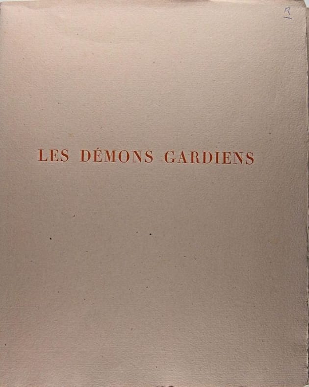 Eaux-fortes de CHAS LABORDE. Aux dépens des amis de l'artiste, Paris, 1937 1 volume in-4 (28,5 x 23 cm) de 120-(1) pages. Page de titre ornée d'une vignette de l'artiste. 15 eaux-fortes hors-texte par Chas Laborde tirées en noir. Reliure de l'époque demi-chagrin bleu, dos lisse orné d'un petit fleuron et de deux filets dorés en tête et en queue, tête dorée, non rogné, couvertures conservées (les deux plats et le dos) en parfait état. Reliure en excellent état malgré un dos légèrement insolé. Intérieur parfait, immaculé, dépourvu de rousseurs. Tirage limité à 261 exemplaires seulement. Celui-ci, un des 190 exemplaires sur Vélin de Vidalon Les Démons Gardiens se sont nos vices et nos travers indispensables racontés par des quidam à la manière gouailleuse de Mac Orlan. Ce sont le démon des cafés, des terrasses et des bars (récit d'un matelot américain), le démon de la rue (récit d'une fille publique), le démon des grandes avenues de l'ouest (récit d'un pauvre employé), le démon des faubourgs (récit d'un agent cycliste), le démon des jardins célèbres (récit d'un touriste), le démon des gares et des music-halls (récit d'un lettré de banlieue), le démon des matinées du bois (récit d'un oisif à la mode), le démon des catastrophes publiques (récit d'un inquiet par principes), le démon du dimanche au grand air (récit d'un gendarme retraité), le démon du voyage (récit d'un reporter), le démon de la beauté obligatoire (récit d'un homme d'affaires), le démon de la digestion au bureau (récit d'un poète), le démon des arts (récit d'un aventurier polyglotte), le démon des rues réservées (récit d'un tourmenté provincial), et enfin, le démon de la fin (récit d'un homme célèbre). Mac Orlan écrit, et cela résume bien son ouvrage : "Le nombre de prostituées augmente, les assassins adolescents pullulent et les imbéciles montent au ciel comme des montgolfières. Le résultat est à la mesure de ceux qui l'ont cherché." Beaucoup d'humour et de belles phrases que n'aurait pas renié Michel Audiard dans ce très beau volume qui flirt avec le curiosa sans y toucher de trop près. On remarquera amusé l'obsession, quasi constante, chez Chas Laborde, à représenter mesdames toison au vent, mesdames affublées des plus denses toisons qui puissent être gravées dans le cuivre, à l'acide. Ce n'est pas déplaisant, bien au contraire, et ça ne pique pas que la curiosité du lecteur attentif. Très beau livre au tirage confidentiel et servi par un admirable texte d'une vigueur incroyable et des illustrations ad hoc.