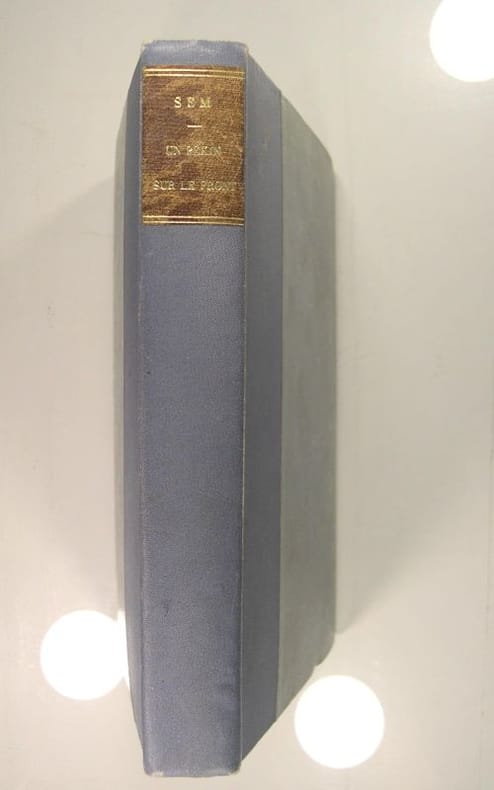 Ouvrage illustré de 150 dessins de l'auteur dont six à double page et 20 à pleine page. Préface de Fernand Vandérem.Un des 225 exemplaires du tirage de luxe : un des 200 exemplaires numérotés sur hollande avec la signature de l'auteur. Exemplaire dont les illustrations sont en partie rehaussées à l'aquarelle. Les exemplaires ordinaires sont en noir et blanc. "Entre mars 1915 et janvier 1917, au cœur de la Grande Guerre, le dessinateur Sem se rend sur les fronts de l’Est et du Nord, pour dresser sur le vif, un portrait saisissant et sincère des combattants et du théâtre des opérations. À Verdun, ou à « Poiluville », sur les routes et autour des champs de bataille, Sem rassemble les croquis et raconte les impressions d’un « pékin sur le front ». Toutes les choses vues et senties par ce maître du crayon nous plongent dans l’humanité d’un conflit dont la description touche parfois au fantastique comme quand il nous montre les soldats tels de vivantes statues de boue ou « filme » un paysage nocturne saisi par le bombardement céleste des obus allemands". Les éditions de Paris, au sujet de la réimpression de 2014.Rare exemplaire en grand papier, dans une reliure mosaiquée. Petite décharge d'une coupure de presse entre deux feuillets blancs avant la couverture.
