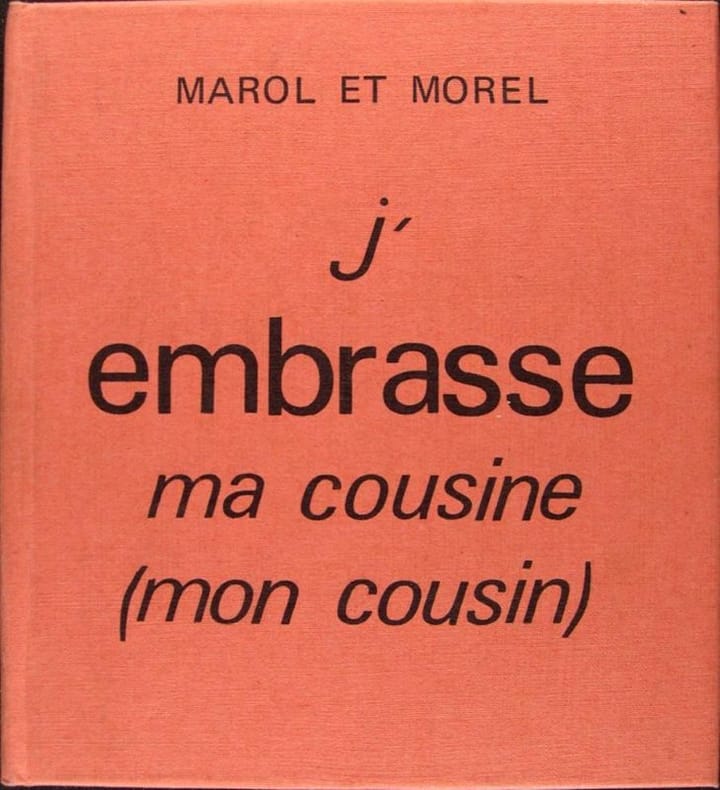 Robert Morel Forcalquier 1980 MAROL et MOREL.J'embrasse ma cousine ( mon cousin ).Robert Morel éditeur. Forcalquier. 1980.Cartonage éditeur in-12 carré ( 15,5 / 14 cm ). Titre en noir sur dos et 1er plat sur fond rose.Illustration de Marol.Textes de Robert Morel. Parfait état.