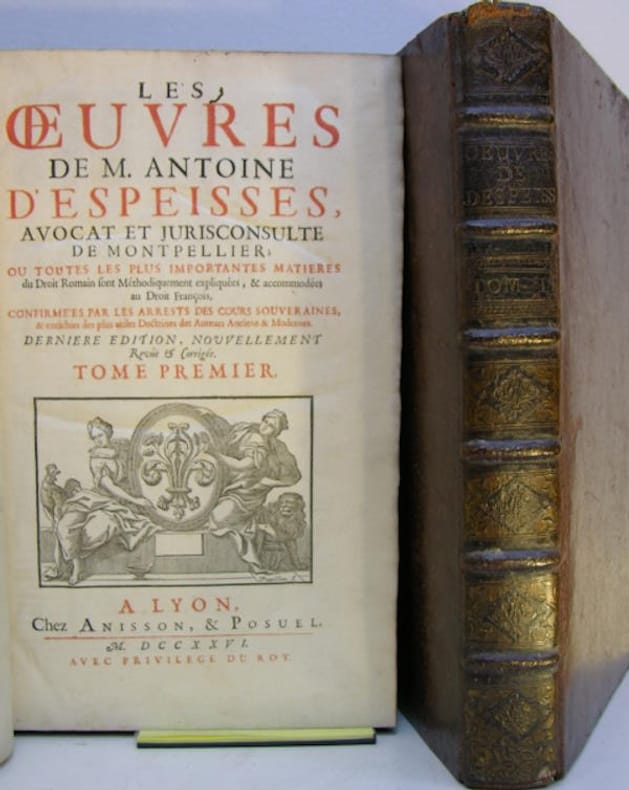 ESPEISSES (Antoine D') jurisconsulte français 1594-1658. Querard T2, Brunet T2, Berthelot T14.4 tomes in 2 volumes Fo in full contemporary calf, ribbed spine with gilt panels, vol. 1 : [2], 471 p. - vol. 2 : [2], 271 p. - vol. 3 : [2], 307 p. - vol. 4 : [2], 450 p., [86].Some flaws : vol. 1 : wormholes on upper border of sheets lightly affecting the text on certain sheets ; rare marginalia - vol. 2 : light waterstamp & foxing ; errors of pagination.