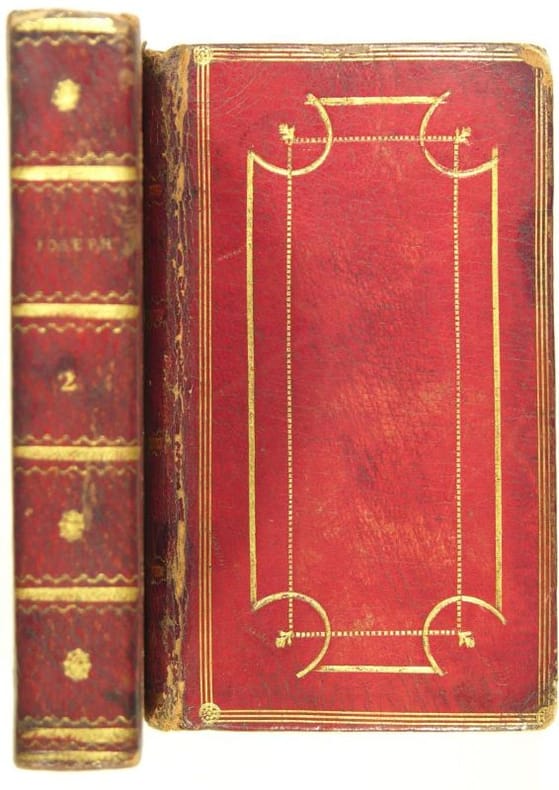A Paris, chez Didot l’Aîné, 1786. 2 volumes petit in/12 en plein maroquin rouge, dos lisse à petits fers dorés, plat à triple filet et cadre, roulette intérieure, doré sur trois tranches, tome 1 : 194 p. et 4 planches hors-textes ; tome 2 : 271 p. et 5 planches hors texte de Marillier. Une coiffe abîmée, coins et mors usés. Bel ensemble cependant.