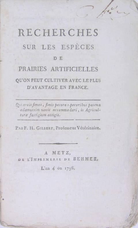 Troisième édition, après celles de 1789 et 1795 (la première sous le titre de Traité des prairies artificielles ou Recherches sur les espèces de plantes qu’on peut cultiver avec le plus d’avantage en prairies artificielles, dans la généralité de Paris). L'ouvrage joua un rôle important dans le développement en France des prairies artificielles, comme en attestent les nombreuses rééditions jusqu'en 1826.Le vétérinaire François-Hilaire Gilbert (1757-1800) avait remporté divers prix sur des questions relatives à l’agriculture, dont la principale concernait précisément les prairies artificielles, de la Société royale d’agriculture de Paris dont il devient correspondant en 1787.Quérard III, 349 (donne 1790 pour l'originale, mais les exemplaires de la BnF sont bien de 1789).Ex-libris manuscrit Alexandre Chapotte. - - VENTE PAR CORRESPONDANCE UNIQUEMENT